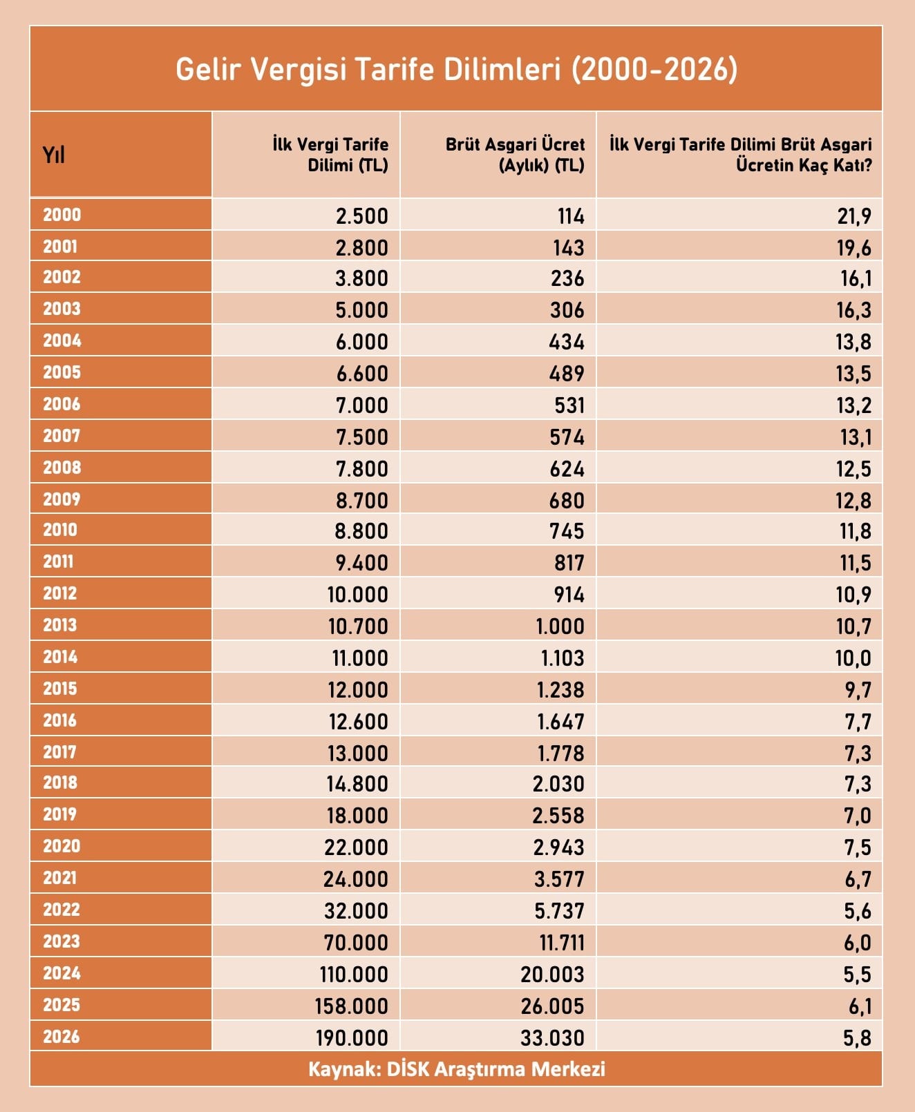 DİSK-AR, gelir vergisi tarifesine ilişkin yaptığı açıklamada, “Dilim dilim vergi soygunu” başlığıyla dikkat çekti. Yapılan açıklamada, yüzde 15’lik ilk gelir vergisi tarife diliminin 190 bin TL olarak belirlendiği ve bu tutarın zaman içinde asgari ücretle olan karşılaştırmasında dramatik bir düşüş yaşandığı vurgulandı.