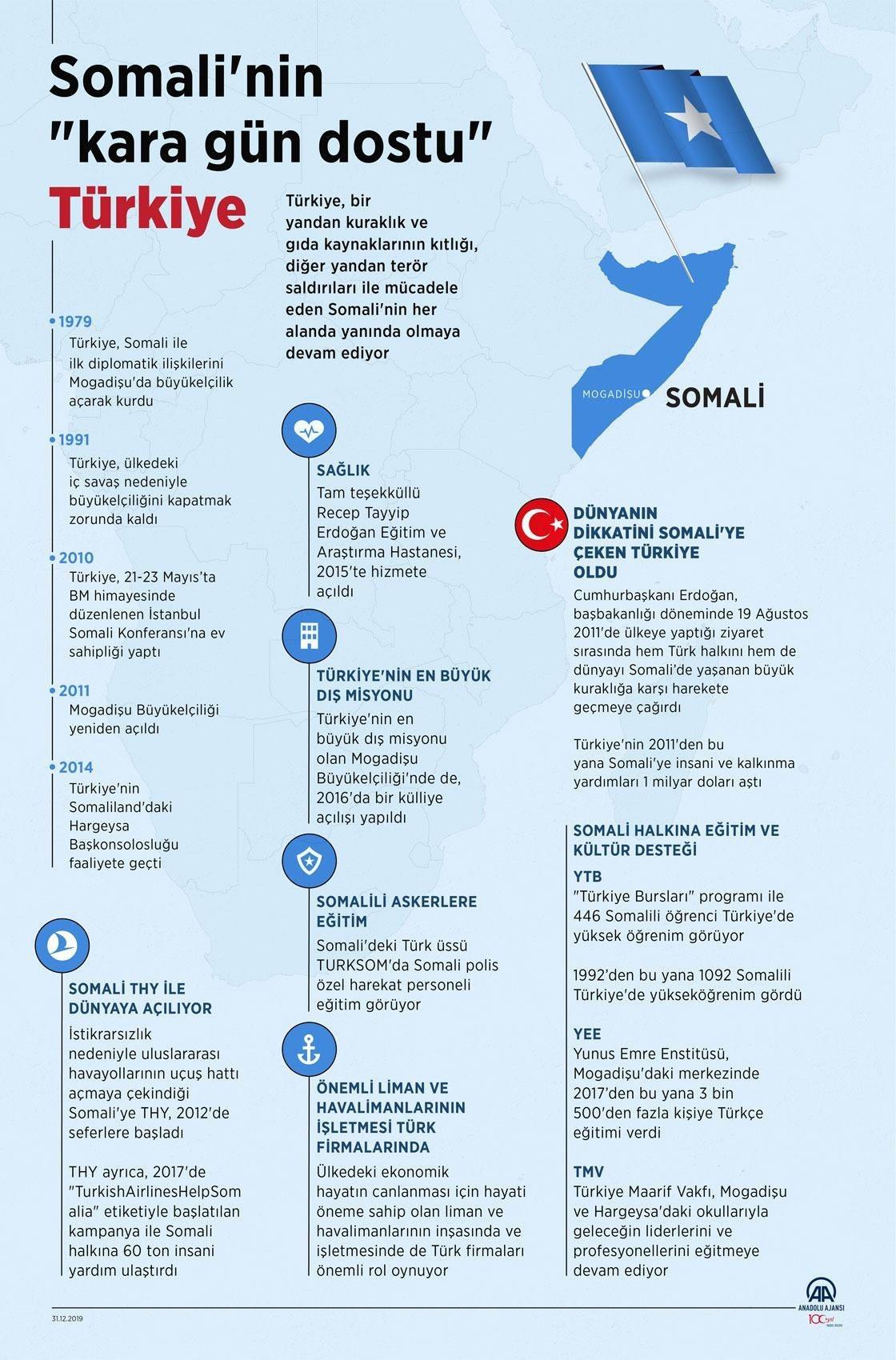 Ankara’nın Somali’de binlerce askeri eğiten bir üs, uzun süreli imtiyazlarla kontrol ettiği bir liman ve havalimanı, Cumhurbaşkanı Erdoğan’ın adını taşıyan bir hastane ve ülkede yarım asır sonra kurulan ilk yabancı banka olan bir Türk devlet bankası aracılığıyla yönetime sızdığı belirtildi.